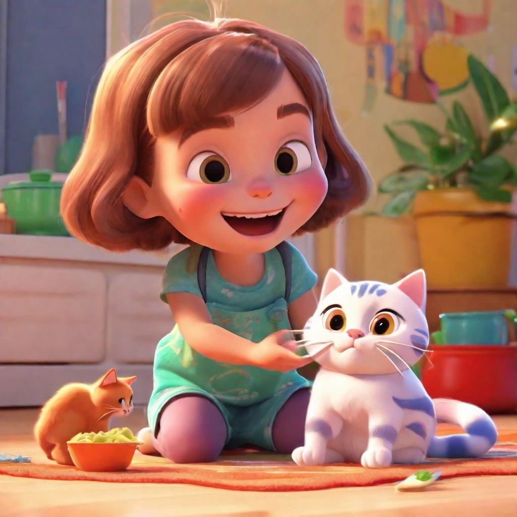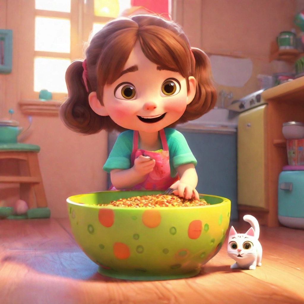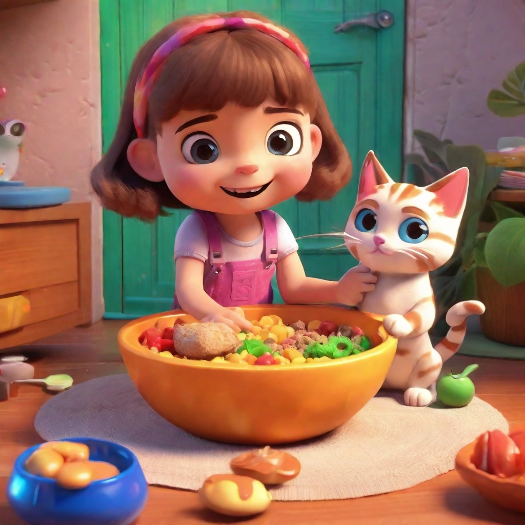 A cute 3D cartoon scene in bright Cocomelon style: A cheerful little girl with big expressive eyes and colorful clothes squats down and places a round bowl of food in front of a fluffy, smiling cat. The cat happily munches on the food, making an adorable crunchy sound. The girl gently strokes the cat’s soft fur, both surrounded by a warm, playful, and colorful background.